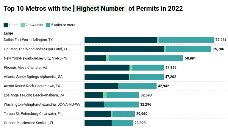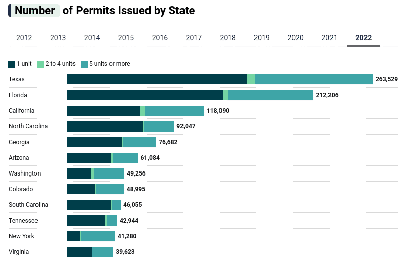 By state, Georgia also stood out, with permits rising 14% year over year to 76,682. The Peach State ranked fifth by the number of permits issued, just behind Texas, Florida, California and North Carolina. In all, 18 states had year-over-year increases in permits in 2022, while 32 had decreases.