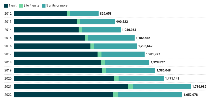 Specifically, the number of permits for single-family and multifamily residences increased every year between 2012 (with 829,658 permits) and 2021 (with 1,736,982 permits) before sliding to 1,652,078 in 2022, Point2 said.