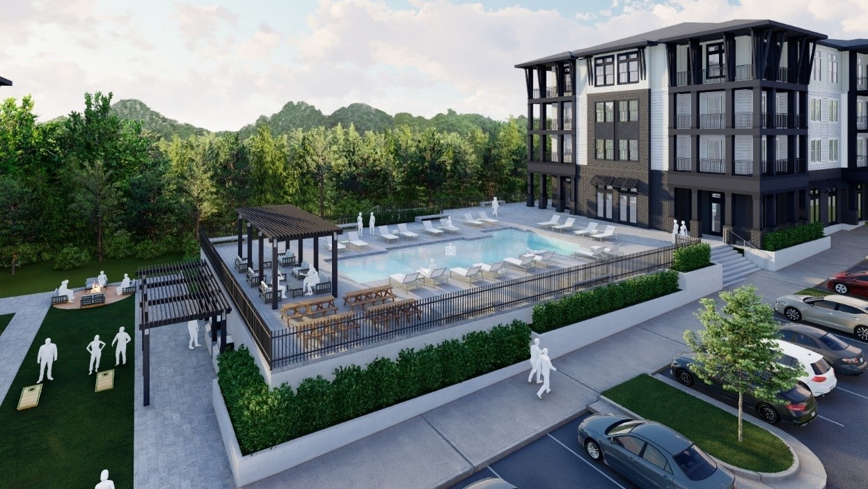 The four-story, modern multifamily development will offer surface parking and a pool. Courtesy of Woodfield Development.