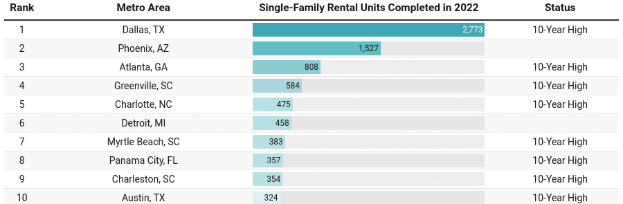 Among U.S. cities, Atlanta is one of the busiest when it comes to build-to-rent activity. During 2022, 808 units were added to the market — the third-highest amount of any U.S. city and a 10-year high locally. The metro with the most build-to-rent development was Dallas, where single-family rental construction reached a 10-year high of 2,773 units completed during the year.