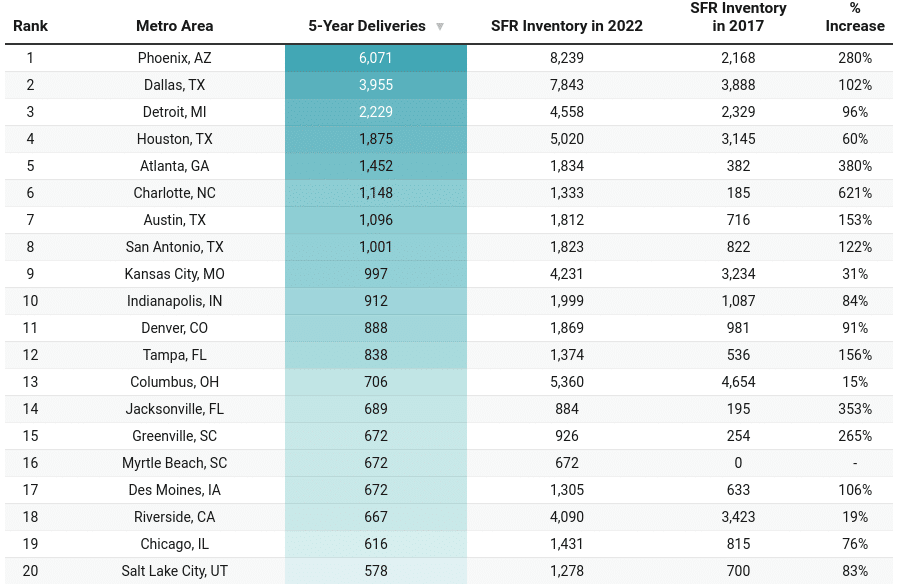 At the end of 2022, Atlanta had 1,834 build-to-rent units in operation, a 380% increase from the 382 available five years earlier. The 1,452 units constructed during that five-year period put Atlanta in fifth place for deliveries nationally. Phoenix led the way, with 6,071 deliveries.