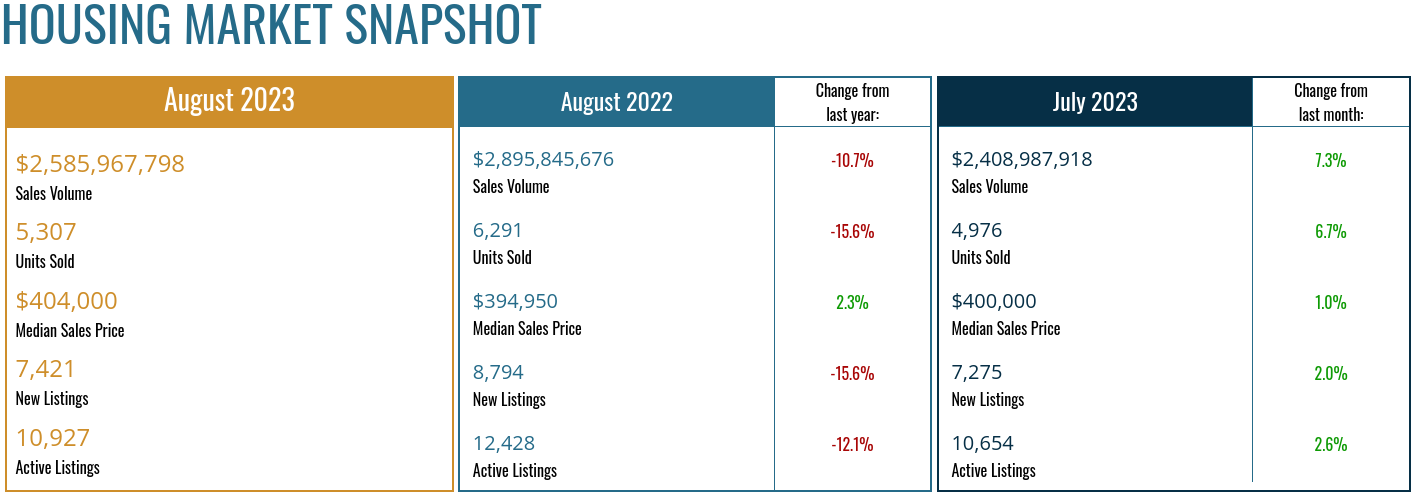 The median sales price of homes sold in August was $404,000, up 1% from $400,000 in July and up 2.3% from $394,950 in August 2022.