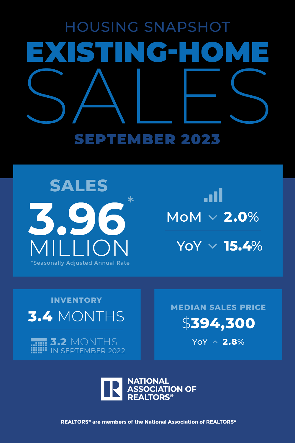Specifically, existing-home sales slid 2% from August to a seasonally adjusted annual rate of 3.96 million. Year-over-year, sales were down 15.4% from 4.68 million in September 2022. The median existing-home price for all housing types in September was $394,300, up 2.8% from $383,500 in September 2022.