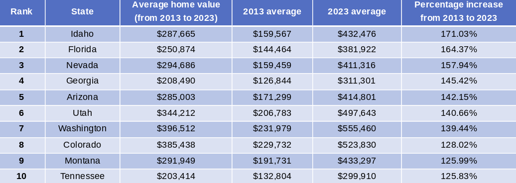 Using data from the Zillow Home Value Index, Architecture Lab ranked every U.S. state based on the difference between average home values in 2013 and 2023. Florida ranked No. 4: A decade ago, the average home was valued at $126,844. Last year, however, that value had jumped 145% to $311,301.