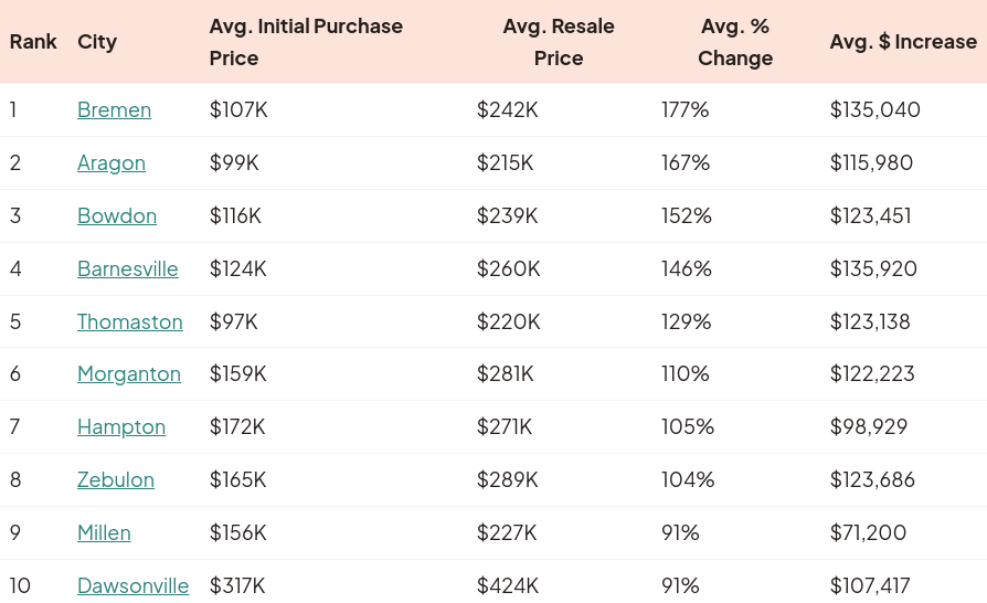 Bremen, population 7,200, came out on top, providing the greatest average return on investment among Georgia localities. According to the study, the average initial purchase price for a home in Bremen in 2023 was $107,000, with the average resale coming in at $242,000, for an average increase of $135,000 or a 177% return.