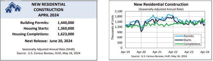 New homes were built at a seasonally adjusted annual rate of 1,360,000, up 5.7% from 1,287,000 in March but down 0.6% from 1,368,000 in April 2023.