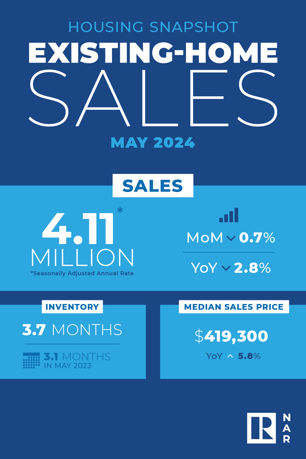 Specifically, sales dipped 0.7% from April to a seasonally adjusted annual rate of 4.11 million. Year-over-year, sales were down 2.8% from 4.23 million in May 2023. The median existing-home price for all housing types in May reached an all-time high of $419,300, up 5.8% from $396,500 a year before.