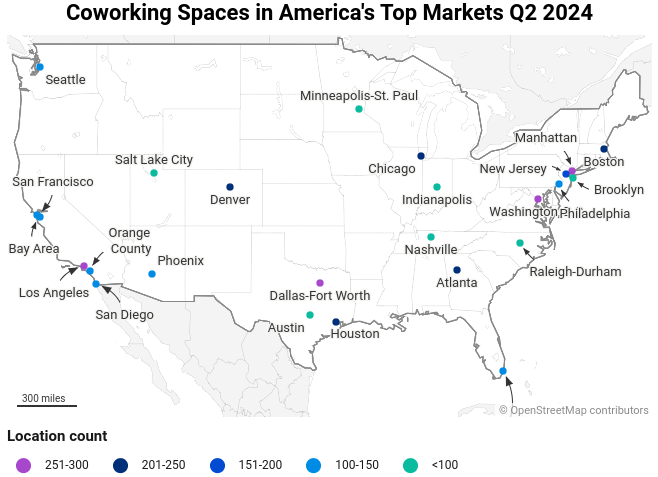 Nationally, the stock of coworking spaces increased 7% in the second quarter, rising to 7,041 locations. By square footage, total coworking space rose 2% to 127.7 million square feet, while the average square feet per location slid 4% to 18,133 square feet.