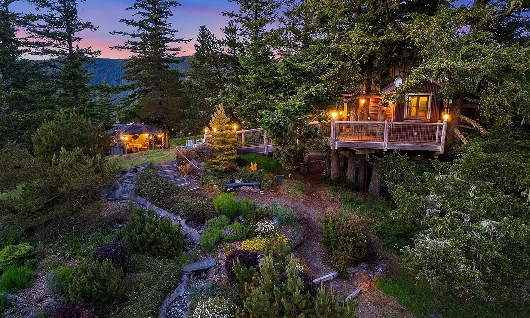 Featured on the Animal Planet series “Ultimate Treehouses,” the picturesque forest getaway is supported by six Douglas Firs on Kahboo Hill. In addition to the main treetop home, the property also includes a stone cottage, outdoor kitchen, in-ground heated swimming pool and over 30 acres of land.