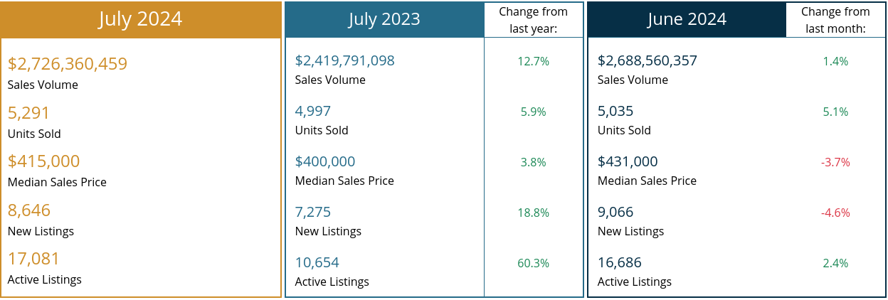 By units, sales were up 5.1% month over month, from 5,035 homes sold in June to 5,291 homes in July. Year over year, sales were up 5.9% from 4,997 transactions in July 2023. By dollar amount, sales were up 9.5% month over month and 5.9% year over year, at $2.73 billion.