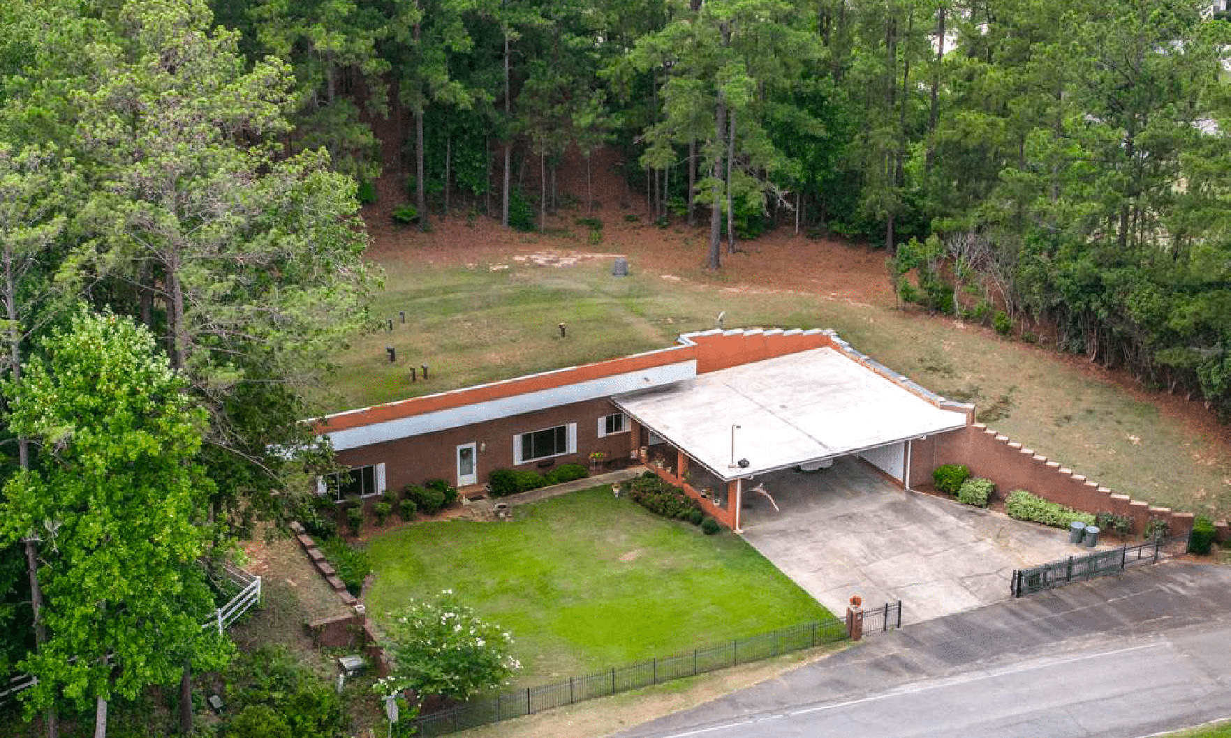 This custom-designed Dublin, Georgia, ranch home is mostly underground, offering energy efficiency and natural insulation. Soil and sod cover three sides of the structure, plus the roof, creating protection from the elements. The interior includes an updated kitchen and modern finishes throughout.