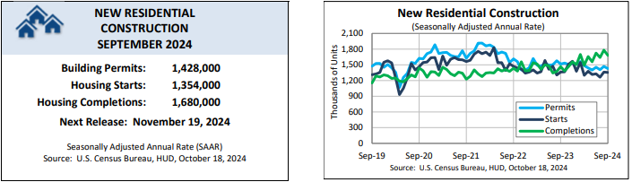 Single-family housing completions were down 2.7% month over month but up 1.6% year over year, at a rate of 1 million, while permits for single-family construction were up 0.3% from August but down 1.2% from September 2023.