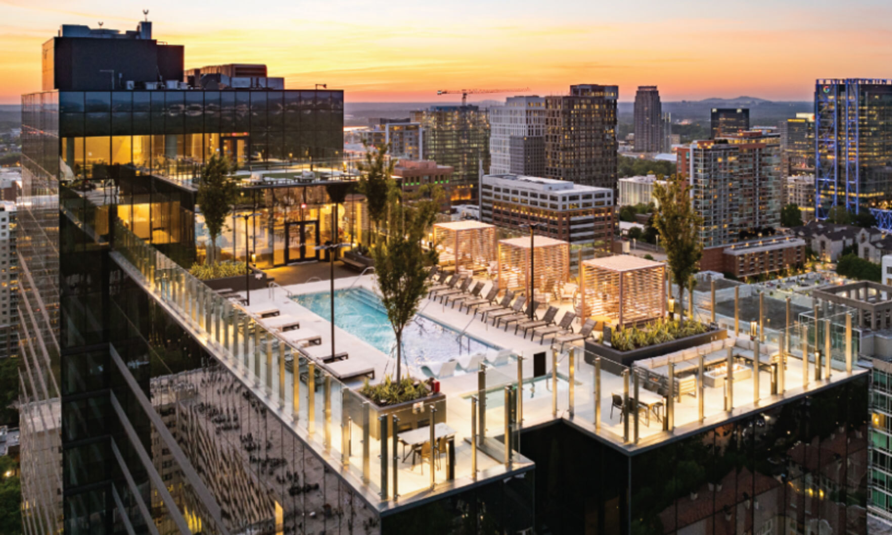 Outdoor amenities include a rooftop pool and lounge area, grilling stations, private cabanas and fire pits. Inside, there is a sauna and massage room, yoga studio, demonstration kitchen, recreation lounge and game room, co-working lounge and pet spa. The property, which is located at the southeast corner of Peachtree Street NE and 8th Street NE, also includes three street-level retail spaces totaling 7,843 square feet.