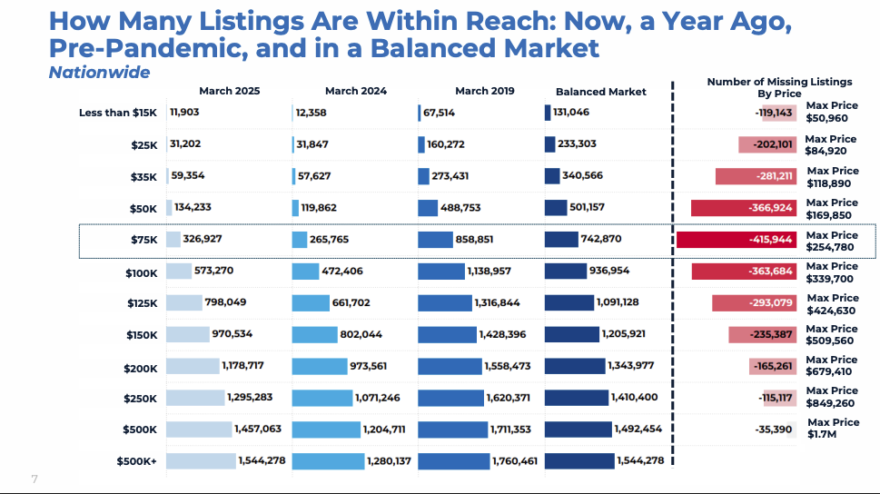Middle-income households earning $75,000 have seen the biggest gains, yet they can afford just 21.2% of listings less than half of what was accessible pre-pandemic.