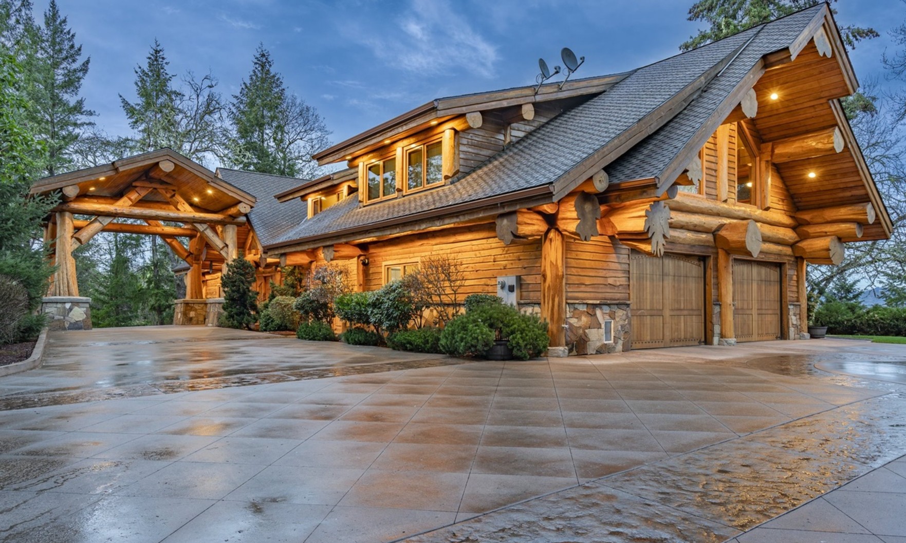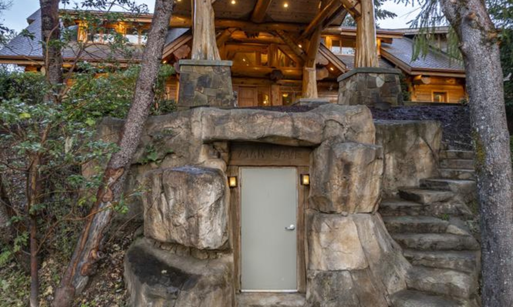 Although it looks like a typical luxury log home from the driveway, the basement has been turned into a concrete cavern, accessible from a hidden “miner’s-style” entrance, according to the listing.