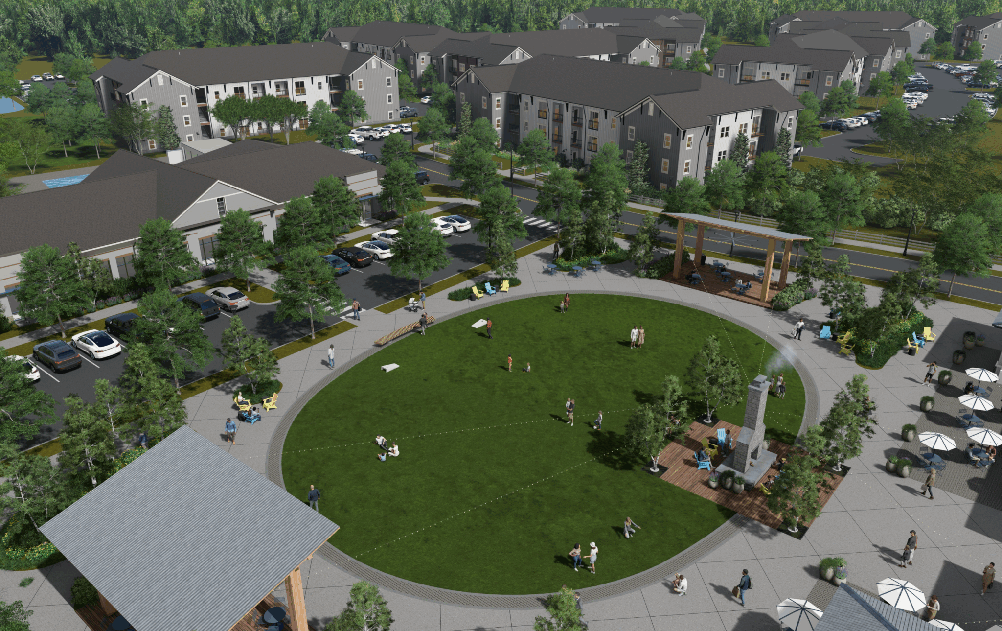 Meadow Glen Village will offer a variety of floor plans across nine buildings, as well as a town green that will be flanked by two 6,000-square-foot retail buildings with food and beverage concepts and service retailers. Portman expects to open it in June 2027.