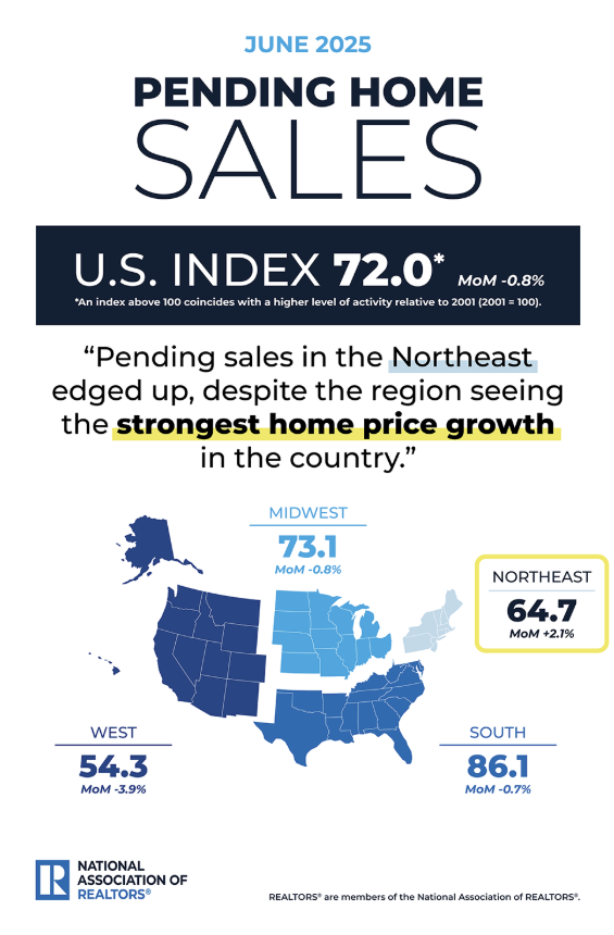 Year over year, pending sales slid 2.8% nationwide. Regionally, sales were unchanged compared to June 2024 in the Northeast and down 7.3% in the West, 2.9% in the South and 0.9% in the Midwest.