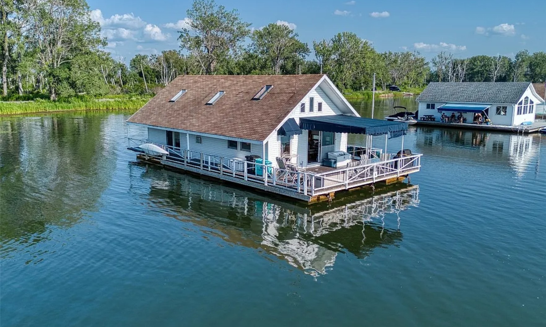 It’s not the only floating home on the pond, though. The buoyant property is actually one of 24 houseboats in the community. The pond even has its own HOA.