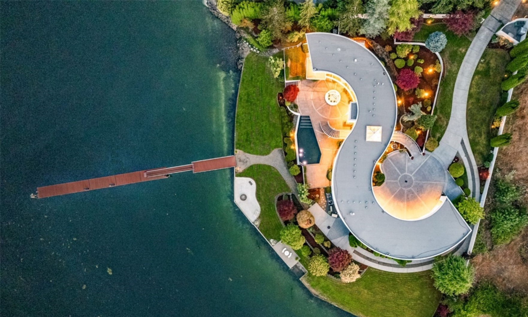 This S-shaped mansion on Wollochet Bay in Gig Harbor, Washington, slithers along 335 feet of beachfront land.