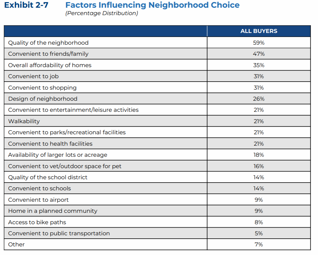 The reasons for picking a particular home are shifting, too. Distance to one’s job has continued to decline as the primary factor behind a purchase — from 52% in 2014 to 31% now — as neighborhood quality (59%) and proximity to friends and family (47%) have increased as key drivers.