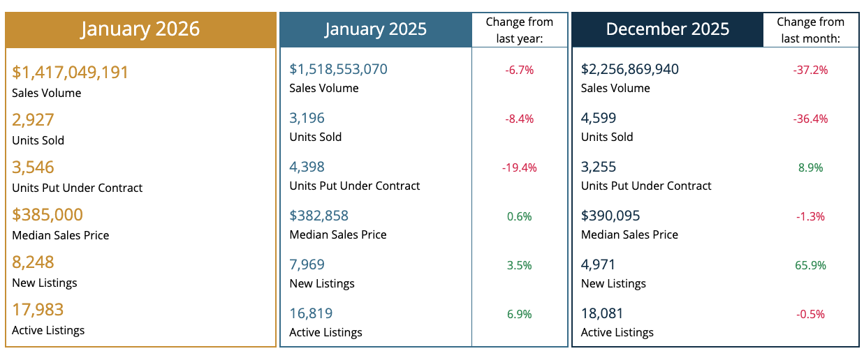 The pace of closed home sales fell in January, reflecting a typical post-holiday slowdown. At just 2,927 transactions, sales were down 8.4% from 3,196 in January 2025 and 36.4% from 4,599 in December. Sales volume dropped 6.7% year over year and 37.2% month over month to $1.42 billion.