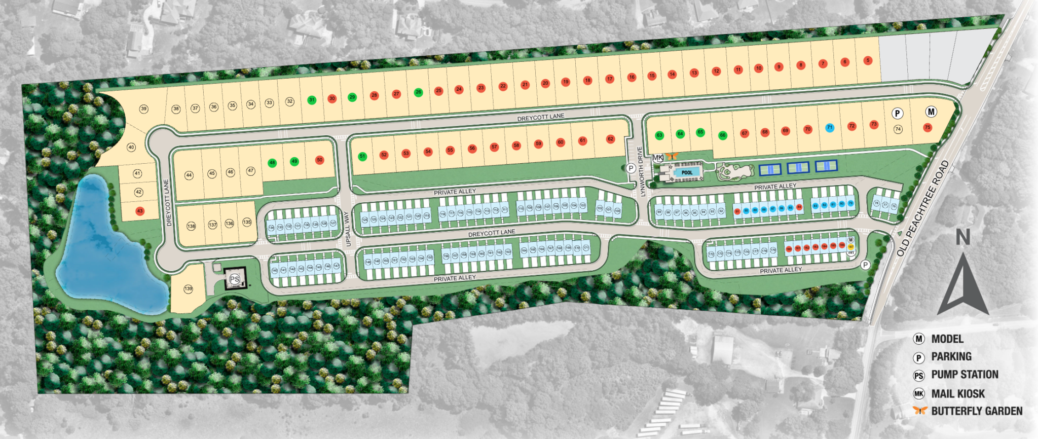 Dreycott Townhomes is part of the Dreycott community, which also features single-family homes. Shared community amenities will include a swimming pool, cabana, two pickleball courts, a dog park and nature play space with a monarch butterfly garden certified by the National Wildlife Federation.
