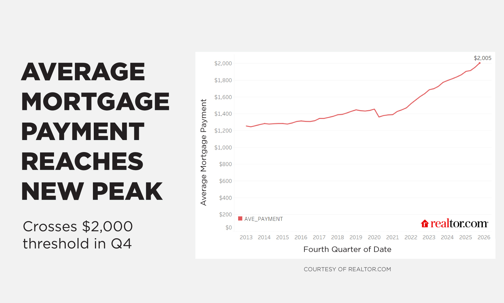 The average monthly payment on an outstanding home loan reached $2,005 in the fourth quarter of 2025, according to Realtor.com’s latest data based on FHFA figures.