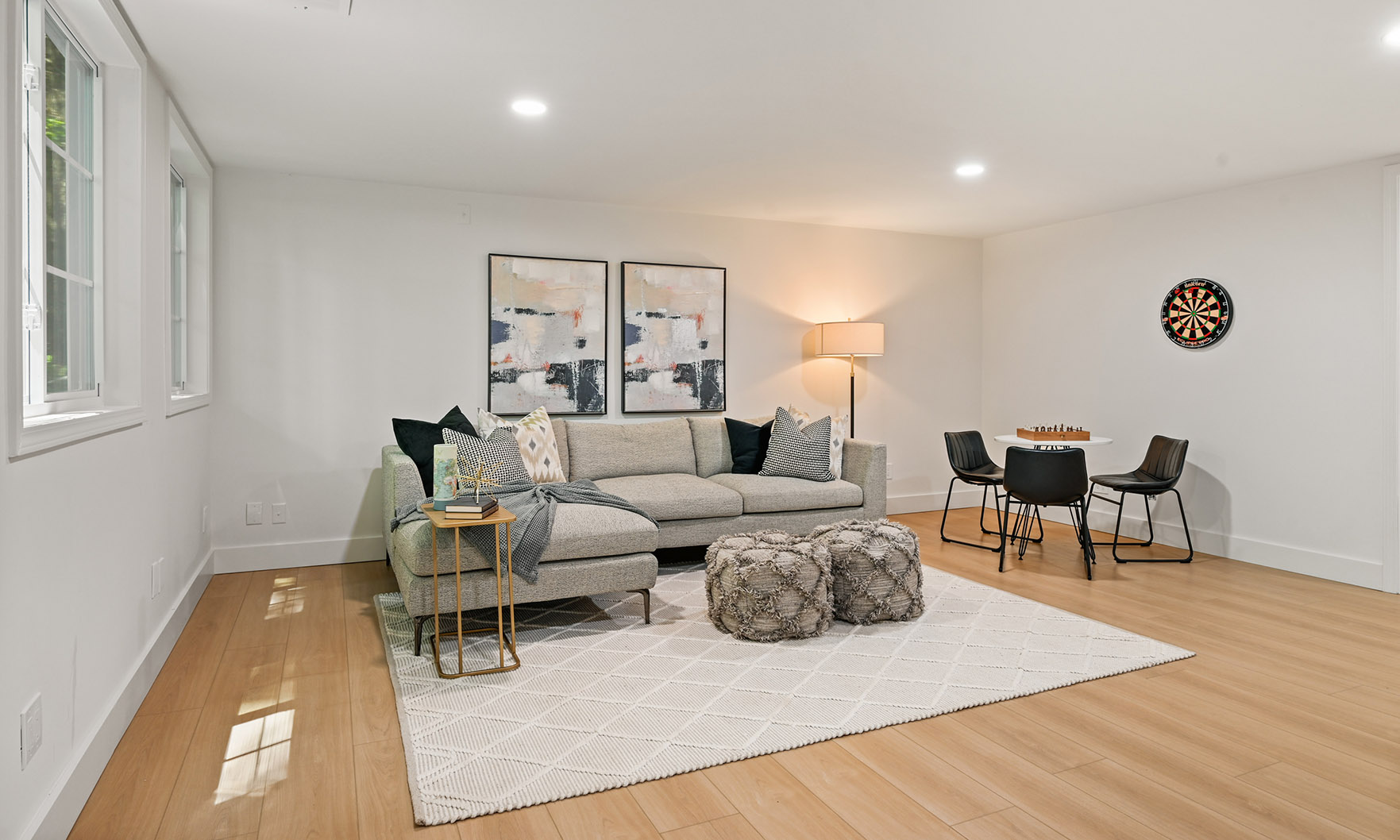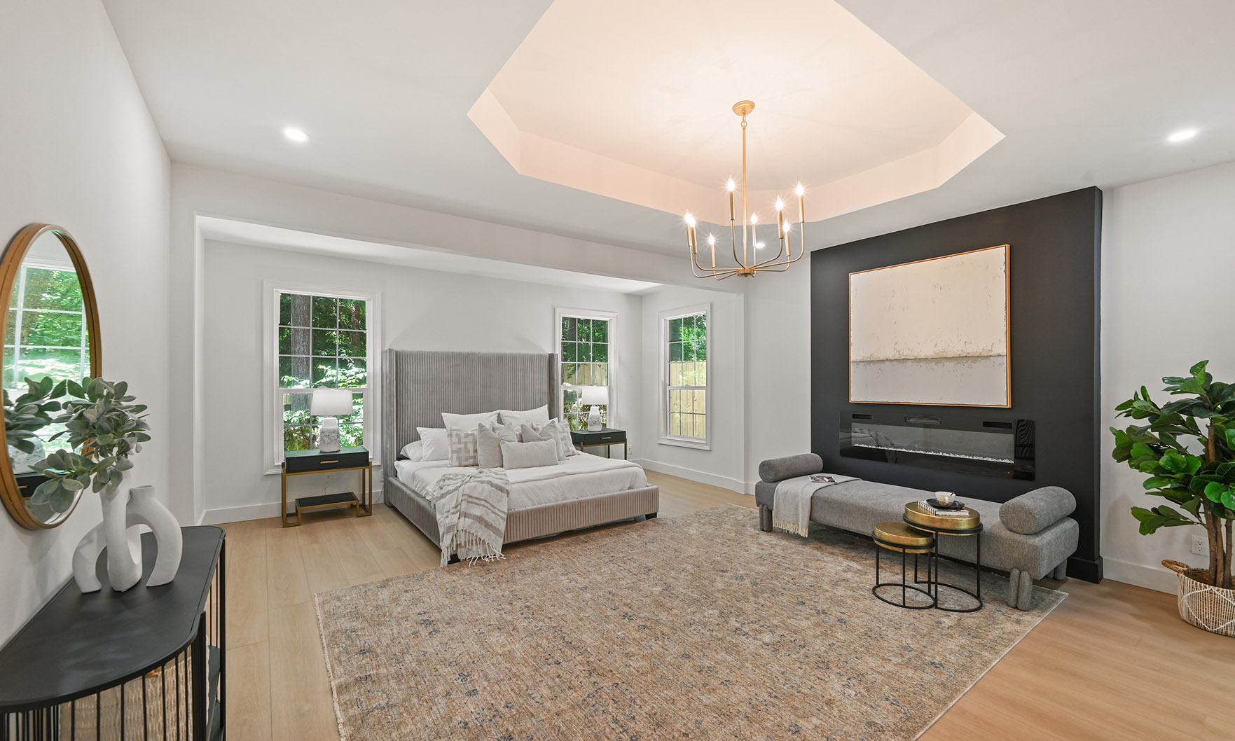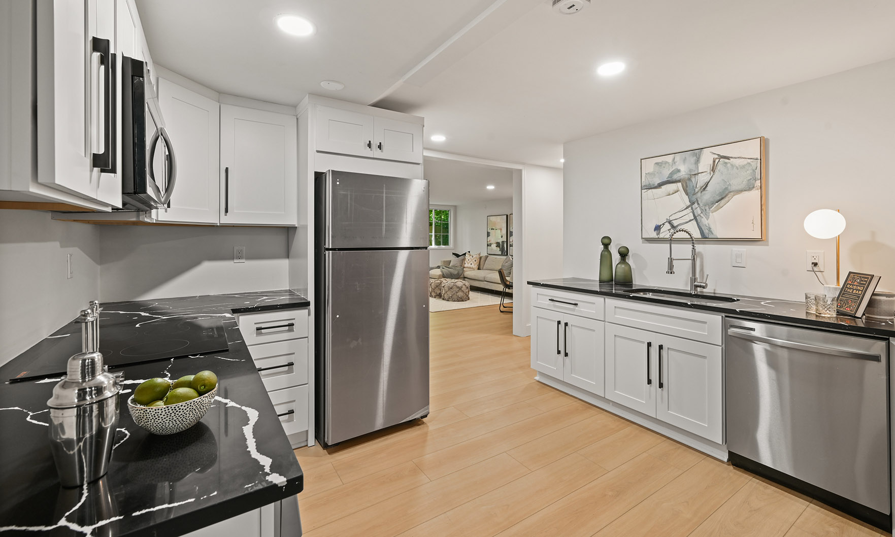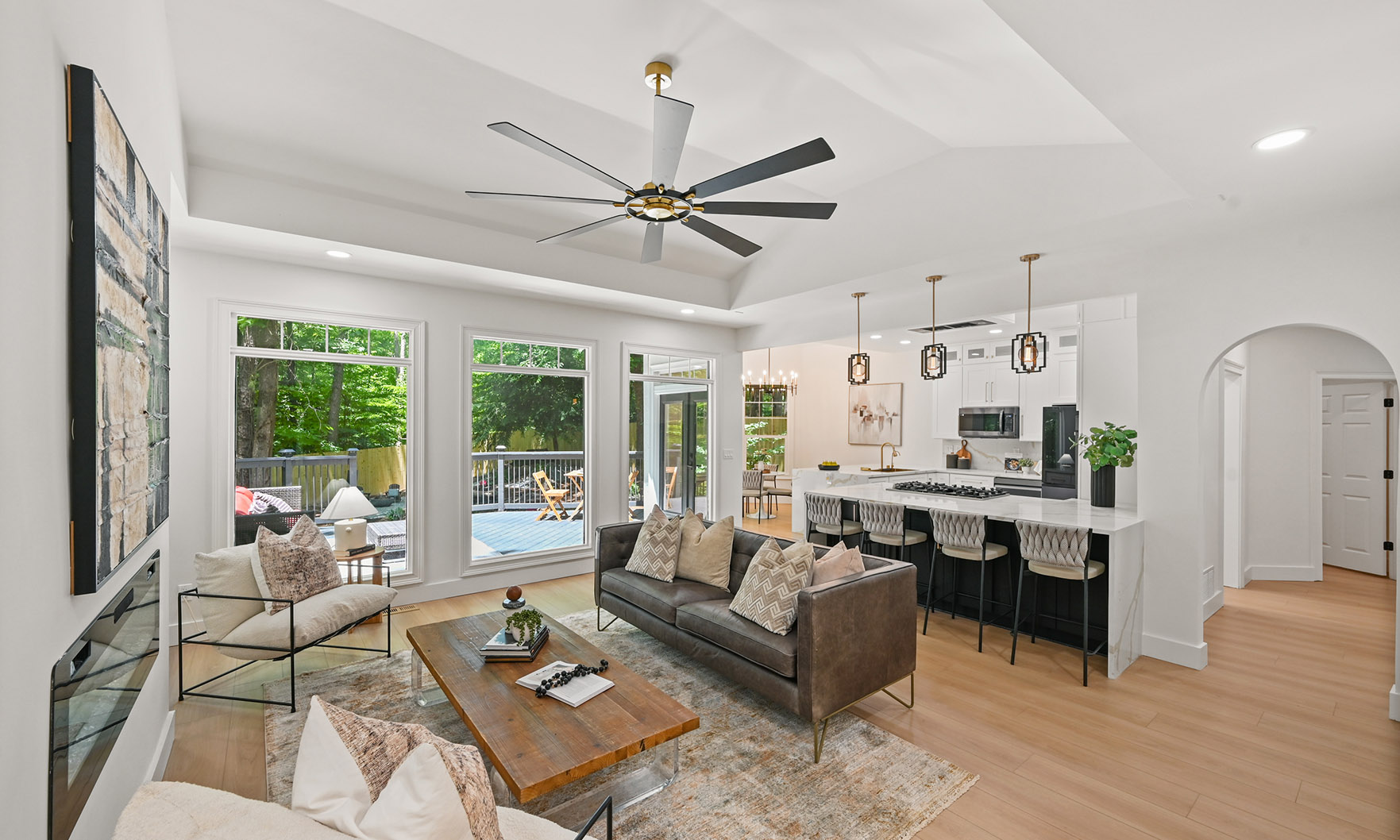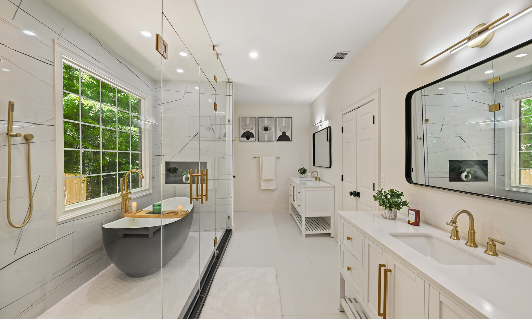 The main kitchen is an absolute showstopper, featuring stunning white cabinets and quartz countertops, all complemented by top-of-the-line, brand-new appliances, including the Samsung Bespoke, four-door refrigerator with a smart family hub, ZLINE gas range, dishwasher, built-in microwave and double ovens. The kitchen’s large, open layout flows seamlessly into the living space, creating the perfect setting for cooking, entertaining or enjoying a quiet evening at home. The adjacent breakfast nook, complete with multiple large windows overlooking the private back yard, adds a touch of charm to this space.