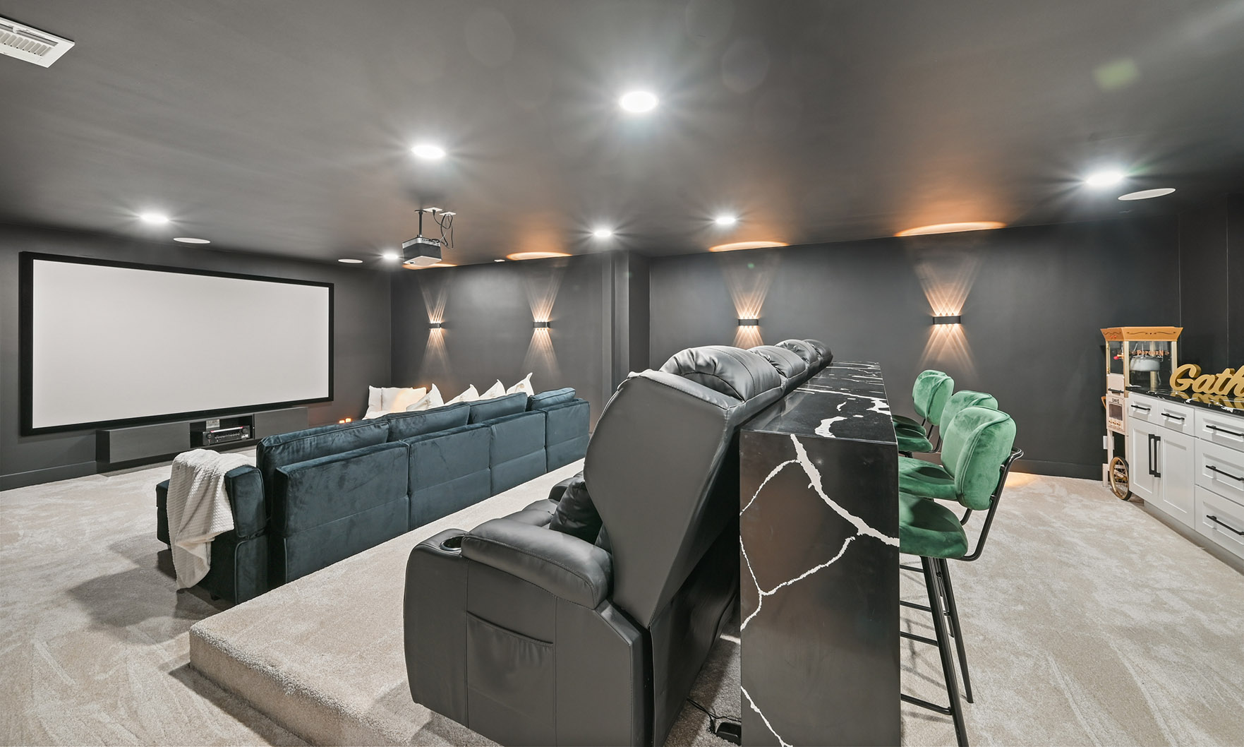 The primary bedroom is a true retreat, featuring an en-suite bathroom with a stunning dual vanity and a large, glamorous shower and tub combination and a walk-in closet. The convenience of garage entry, a laundry room and a full bathroom on the main level adds to the functionality of the home. Double French doors lead out to the large back deck and backyard, which offers privacy and tranquility. The upper level of this exquisite home boasts three bedrooms, two bathrooms and multiple flex rooms that can be customized to your unique needs. The lower level offers a versatile space that can be utilized as the perfect in-law suite with its own living area, bedrooms, bathroom, full kitchen and laundry. It could also be used as the perfect family room or man cave, as a secondary living space, a gathering space, home gym, studio or office. It also offers your very own movie theater and bar for entertainment.