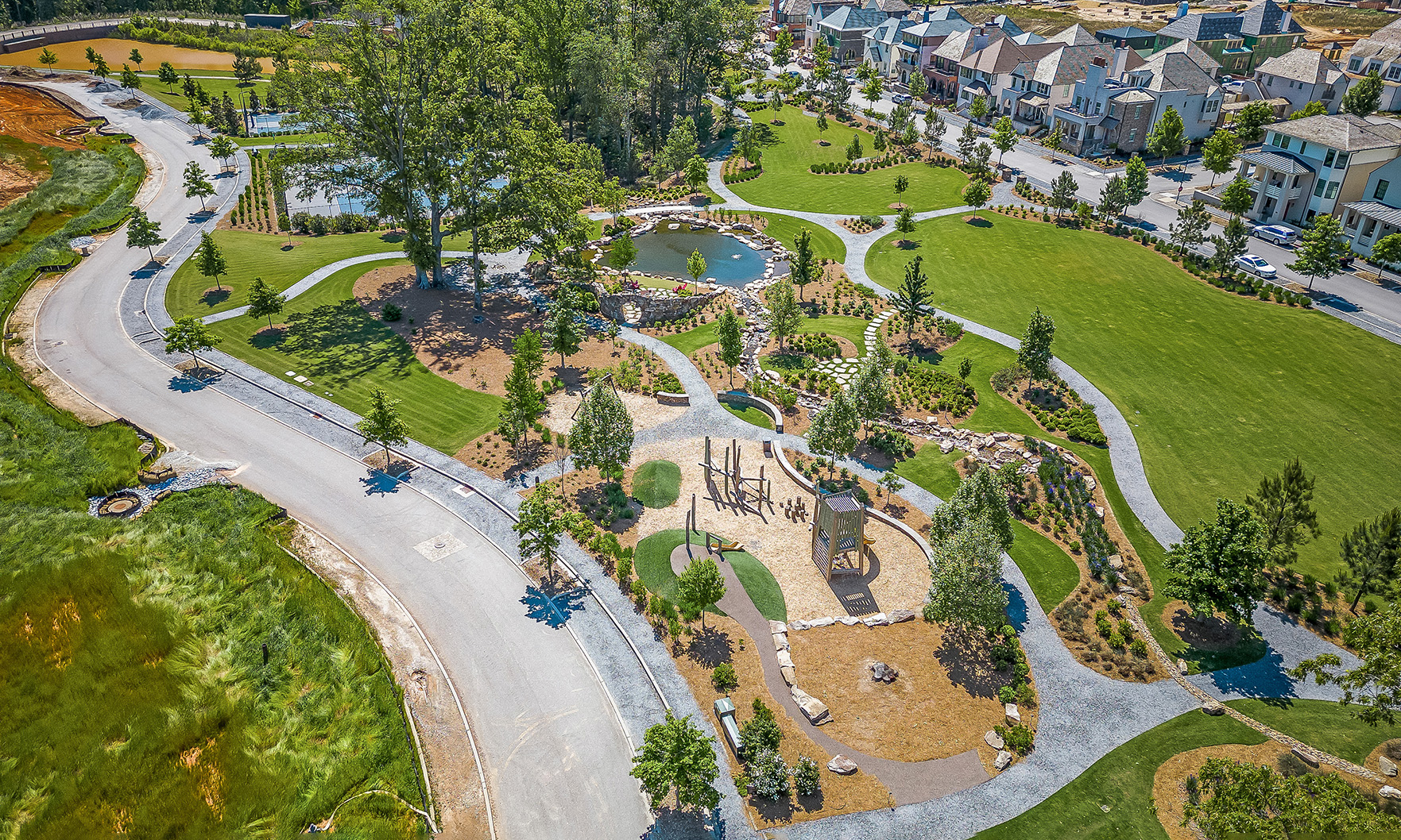 Situated across the street from Trilith Studios, the largest film studio in the United States, sits a vibrant new urbanist town called Trilith. The 235-acre, master-planned residential and mixed-use development is a contemporary concept in walkable living and a haven for storytellers, makers and creatives. The community is home to actors, movie producers and stunt doubles, who live next door to doctors, teachers and business owners. Homes in the purpose-built community offer a wide variety of living options, including estate homes, canopy homes, townhomes and multifamily dwellings as well as 375-square-foot microhomes. Trilith offers an original living opportunity which incorporates artwork, murals, greenspace and sculptures into every element of its design to create an inspiration in each corner of the town.